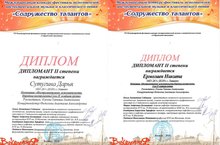 Дипломантами II степени в VII Международном фестивале-конкурсе "Содружество талантов" стали учащиеся класса Клюевой Татьяны Анатольевны Сутугина Дарья и Ермолаев Никита.