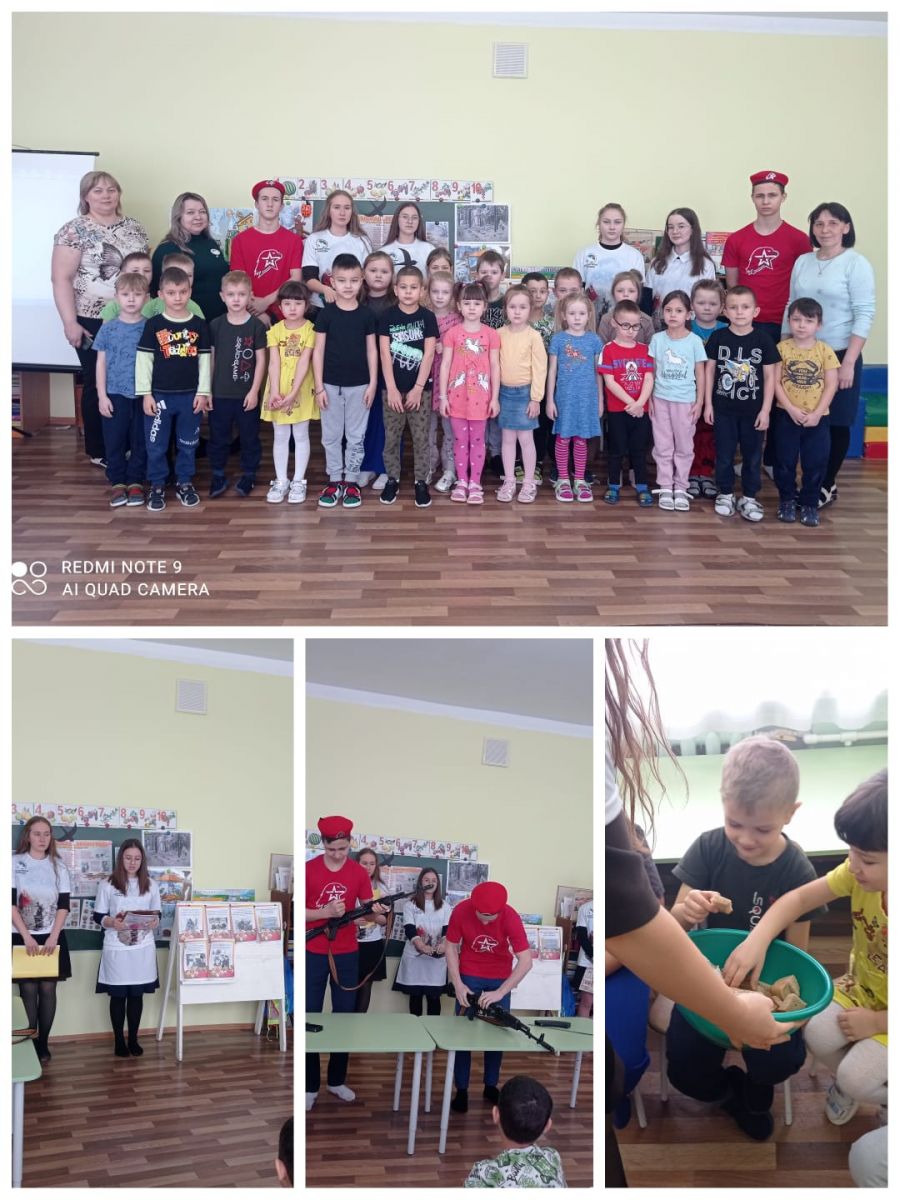 Волонтёры рассказали о блокадном Ленинграде, о подвигах жителей, о детях которые внесли свой вклад в победу. Наши воспитанники подержали в руках " блокадные 125грамм хлеба". Волонтёры познакомили с оружием, которое использовали в войну и показали разборку и сборку автомата.