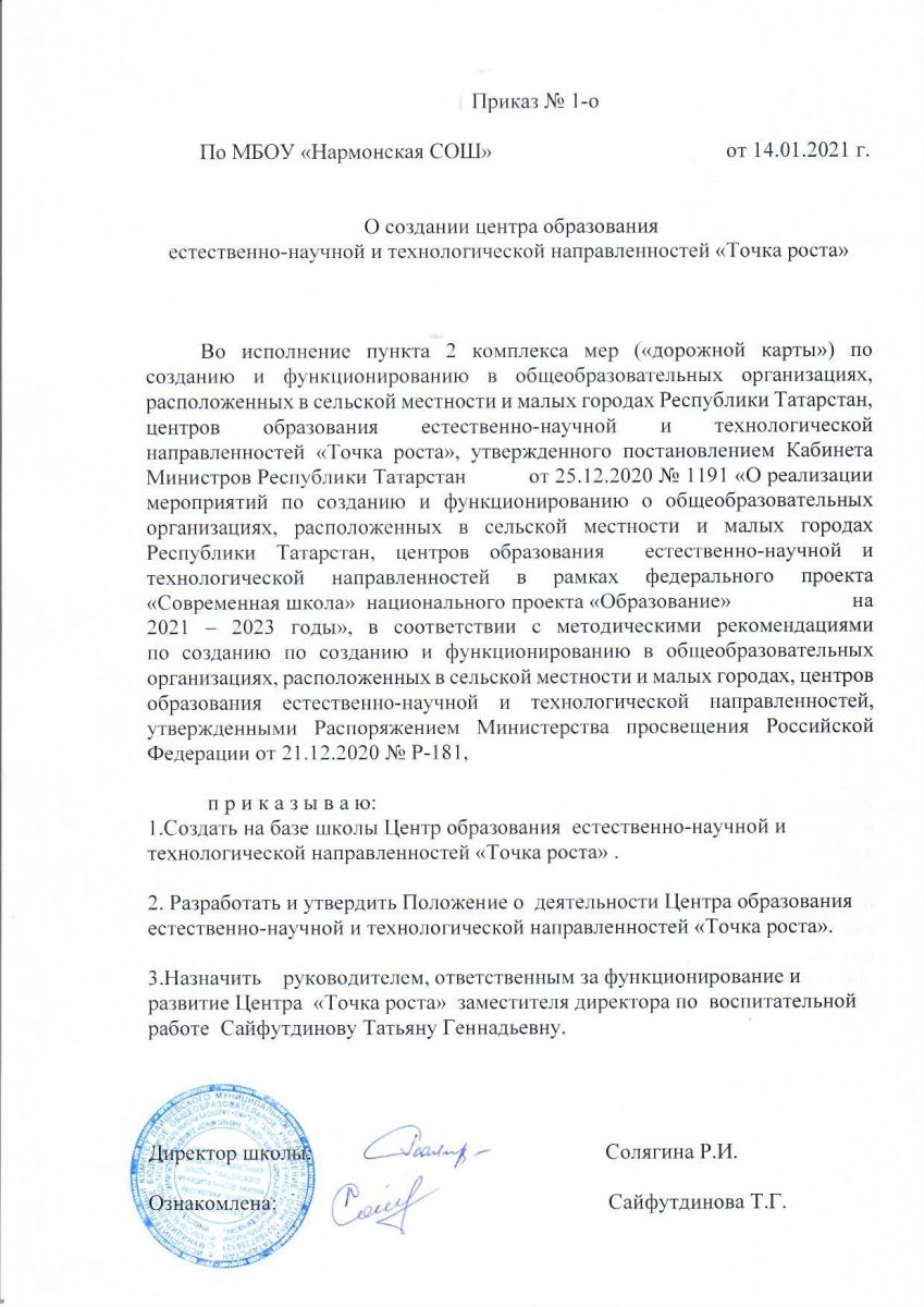 Приказ по МБОУ "Нармонская СОШ" о создании центра образования естественно-научной и технологической направленностей