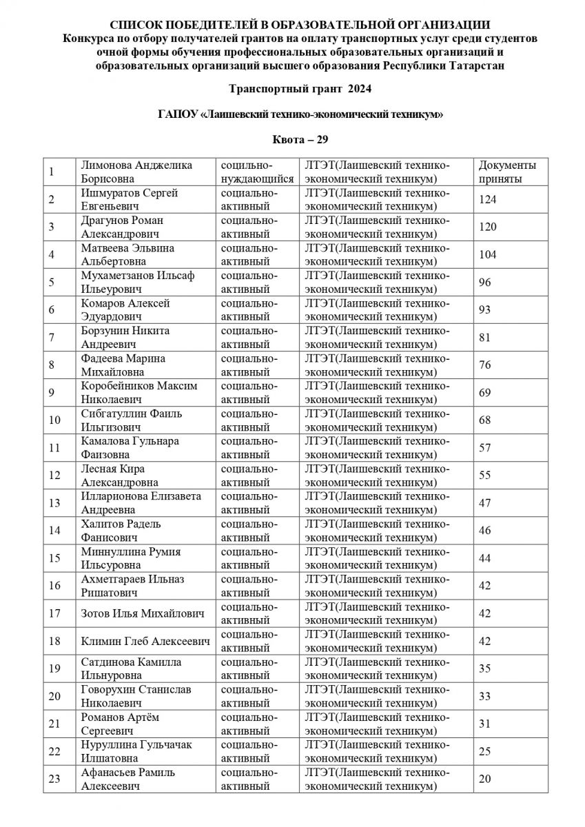 Конкурса по отбору получателей грантов на оплату транспортных услуг среди студентов очной формы обучения профессиональных образовательных организаций и образовательных организаций высшего образования Республики Татарстан Транспортный грант 2024