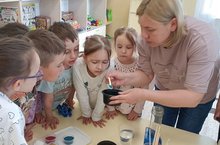 Воспитанники старшей группы с удовольствием исследовали песок : что происходит когда добавить в него воды, проверяли растворяется ли он в воде, для чего нужен песок . -