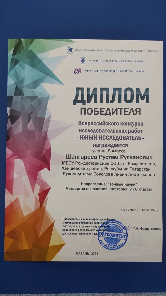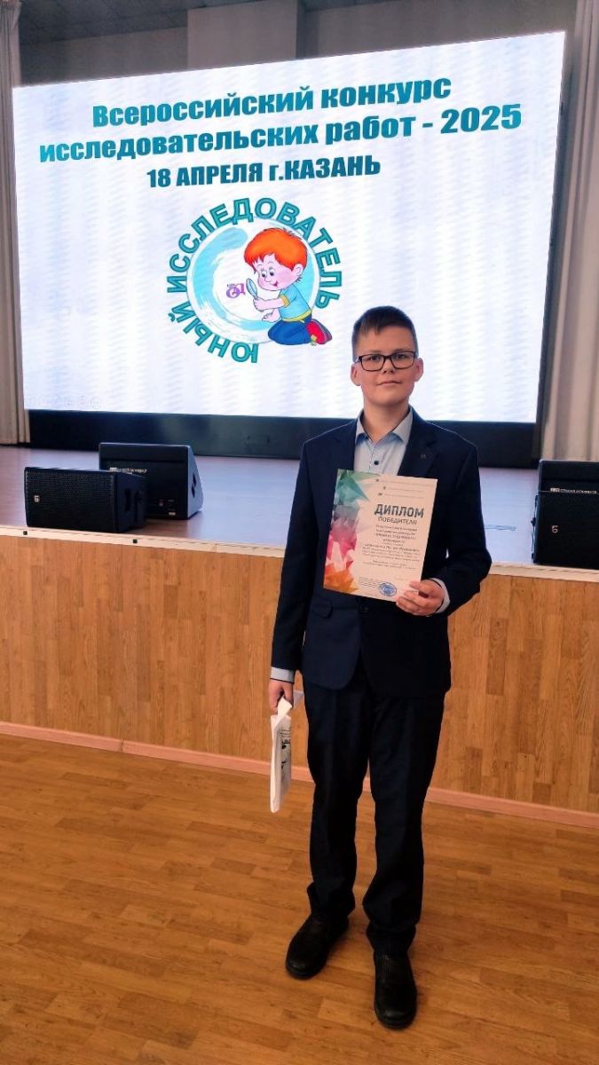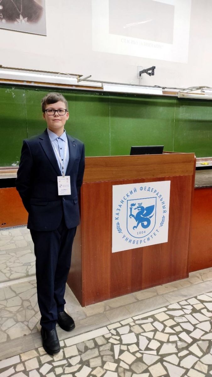 9. 18 апреля на базе СУНЦ - IT-лицей КФУ прошёл Всероссийский конкурс исследовательских работ «Юный исследователь». Его соорганизатором стал Институт филологии и межкультурной коммуникации КФУ. Наш ученик 8 класса Шангареев Рустем победил в двух научных конкурсах по физике и астрономии во Всероссийском научном конкурсе исследовательских работ "Юный исследователь" среди участников 7-8 классов. Научный руководитель Соколова Лидия Анатольевна. Фото 1 Фото 2 Фото 3 Фото 4