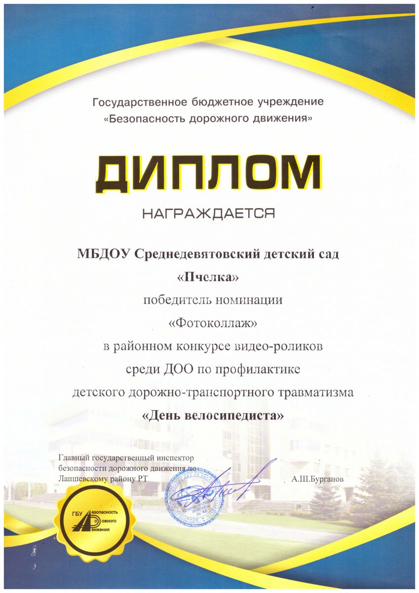 Опубликовано: 05.12.2017МБДОУ Среднедевятовский д/с "Пчелка" победительв номинации "Фотоколлаж" в районном конкурсе видео-роликов среди ДОО по профилактике ДДТТ "День велосипедиста"