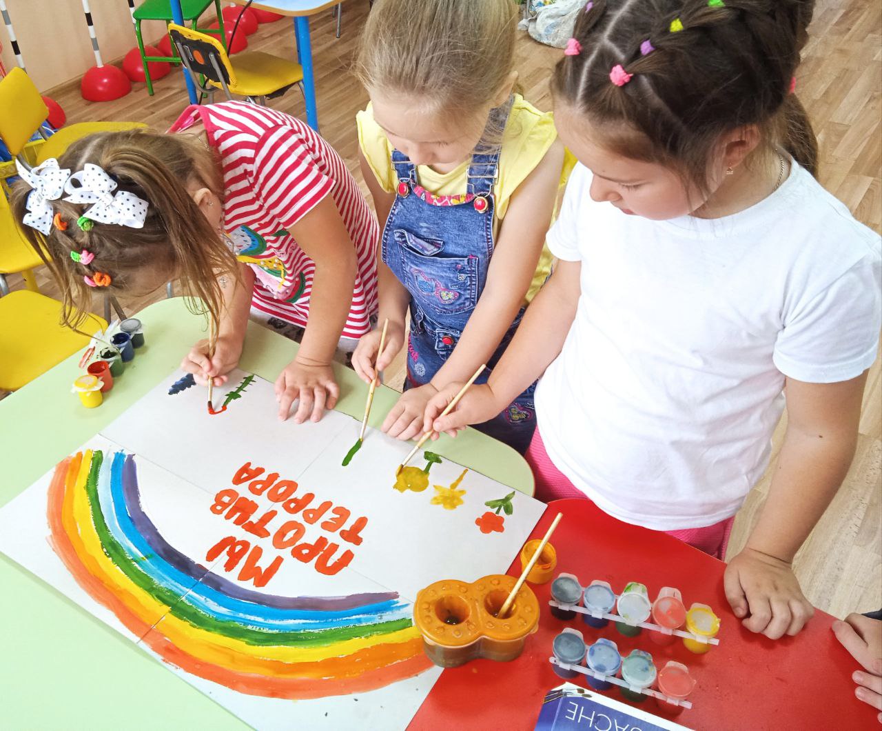 Опубликовано: 05.09.2023Мероприятие приуроченное к "Дню Солидарности в борьбе с терроризмом", прошёл 5.09.2023г ,в МБДОУ д/с "Пчёлка", участие приняли 13 детей. Познакомили детей с трагедией 3.09.2004г., в школе 1 г. Беслан. Наши дети присоединились к акции "Капля Жизни", где вспомнили жертв терроризма и напоили водой, символически, всех тех, кого уже с нами нет. В завершении, мероприятия, дети нарисовали совместную работу " Мы Против Террора "