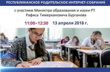Республиканское интернет родительское собрание. Очередное республиканское родительское интернет-собрание состоится в пятницу 13 апреля в 11.00. Собрание на самую животрепещущую тему как подготовить ребёнка к ЕГЭ проведёт лично глава mon.rt Р.Т. Бурганов Вопросы к специалистам принимаются на roditelirtmail.ru 13.04.2018