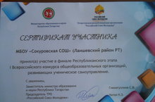 Совет старшеклассников нашей школы выиграл в районном этапе I всероссийского конкурса общеобразовательных организаций, развивающих ученическое самоуправление. В соответствии с планом работы МО и Н РТ 1 февраля 2015 года состоится очный финал республиканского этапа (Центр «Сэлэт: г.Казань, ул. Островского,23, конференц - зал), на который отправятся наши учащиеся.
