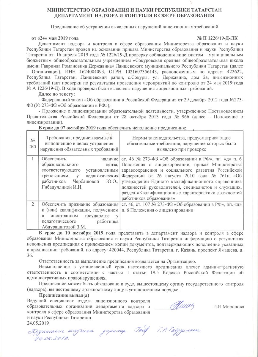 24.05.2019 Предписание об устранении выявленных нарушений лицензионных требований