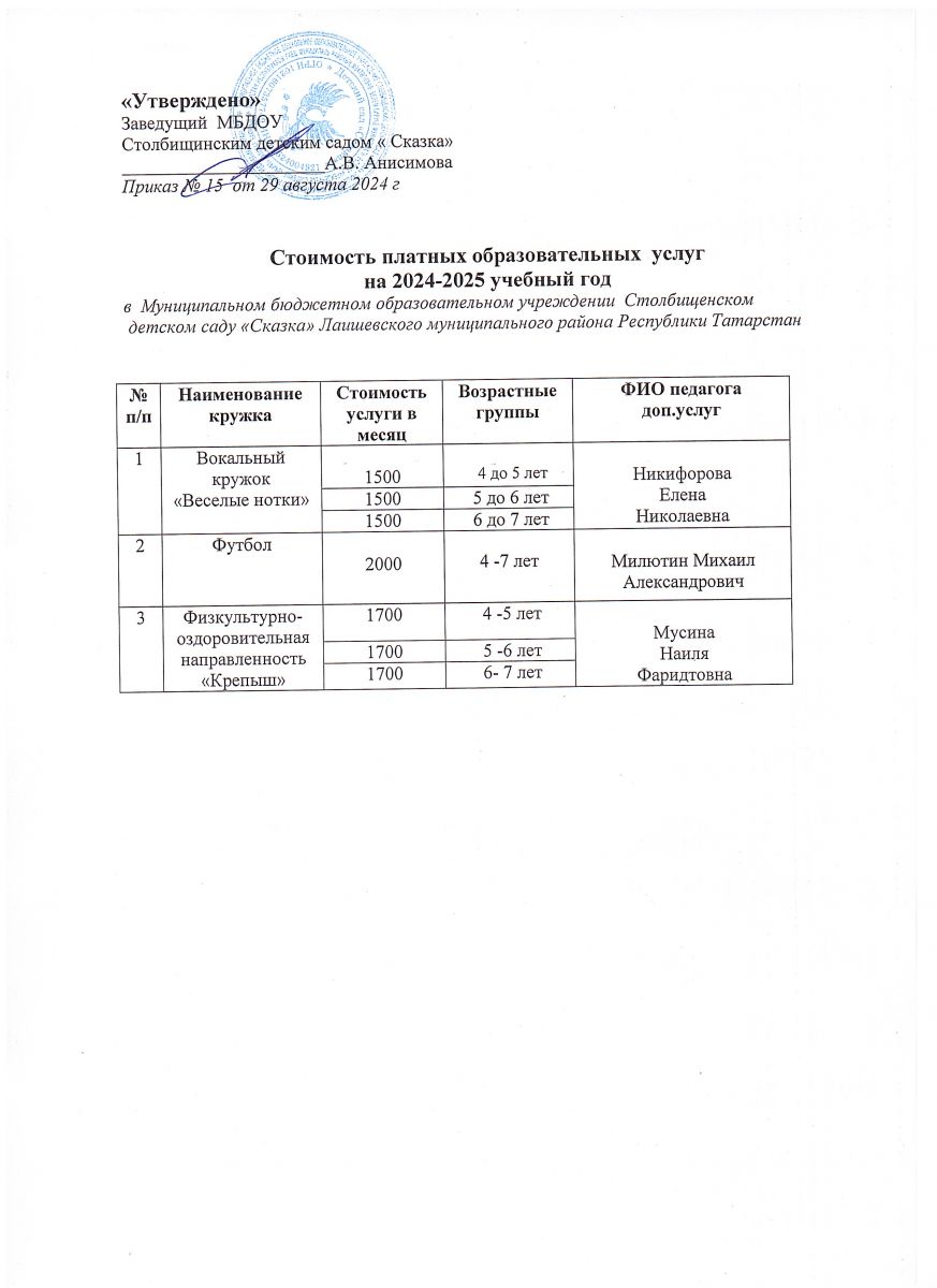 Стоимость дополнительных платных образовательных услуг на 2024-2025 учебный год
