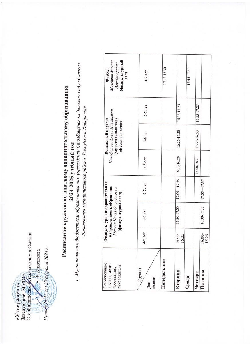 Расписание кружков по платному дополнительному образованию на 2024-2025 учебный год