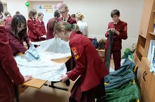 Ученики 10 класса с классным руководителем Ивановой З.П. для наших солдат сделали заготовки для маскисеток .