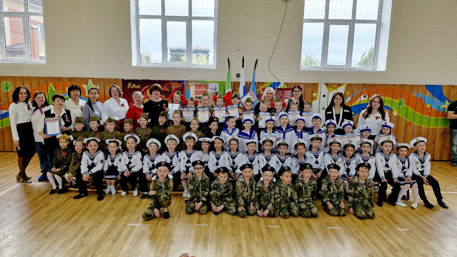 На базе Усадской прогимназии прошёл муниципальный конкурс "Смотр строя и песни" среди воспитанников дошкольных образовательных организаций Лаишевского района, приуроченный к 80 - летию Великой Победы. Это замечательное мероприятие способствует развитию физической подготовленности воспитанников, умению выполнять строевые упражнения, развитию командного духа. Все участники были награждены грамотами!