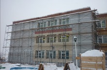 Здание лицея начали обшивать керамогранитом. Кроме эстетической стороны, есть и практическая сторона. Здание утепляется минеральной ватой.