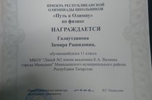 Обучающаяся 11 класса МБОУ "Лицей №2 имени академика К.А. Валиева города Мамадыш" Галяутдинова Замира Рашидовна стала призёром Республиканской олимпиады школльников "Путь к Олимпу" по физике.