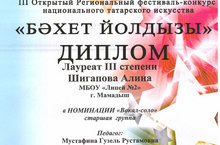 Ученица нашего лицея Шигапова Алина, под руководством Г.Р.Мустафиной стала лауреатом 3 степени в III Открытом региональном фестивале-конкурсе национального татарского искуства "Бәхет йолдызы" в номинации "Вокал-соло". Поздравляем!!!