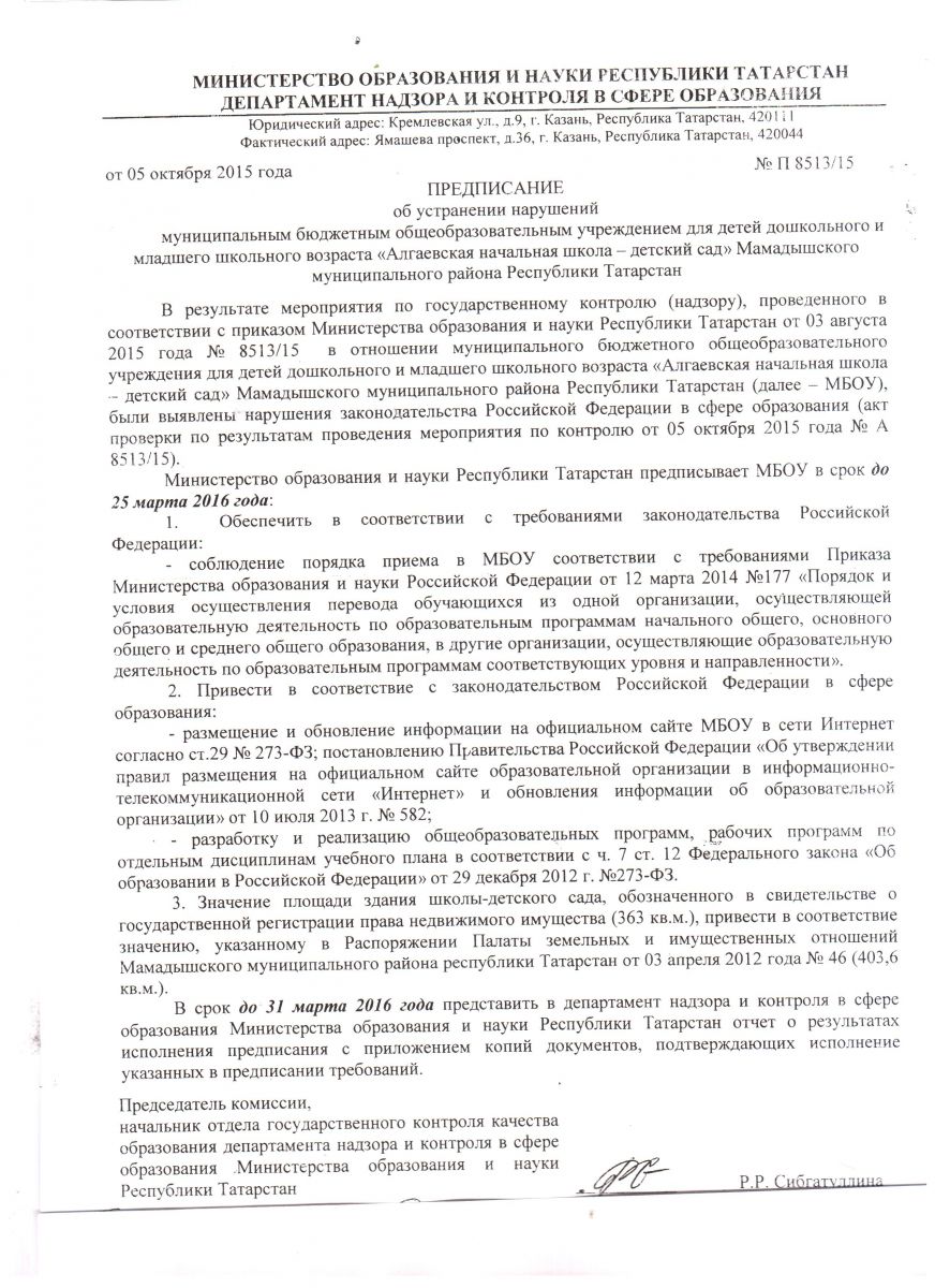 Предписание департамента надзора и контроля в сфере образования МО и Н РТ от 05 октября 2015 года