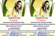 Подведены итоги регионального конкурса чтецов, посвященного творчеству Мусы Джалиля "Джалиловские чтения". Наши воспитанницы Фазлиева Мадина (руководитель Ахметшина Э.Н.) и Егорова Лиана (руководитель Нургалеева З.Р.) получили диплом I степени. Поздравляем!!! Желаем дальнейших побед.