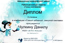 Поздравляем нашего воспитанника Чулкина Данила и его руководителя Ахметшину Э.Н. с призовым 2 местом в районном конкурсе поделок "Город снеговиков", в номинации "Самый забавный, смешной снеговик"