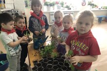 Балалар тәрбияче белән бергәләп, петуния, бәрхет гөле һәм башка үсентеләрне аерым савытларга күчереп утыртты. 17.04.2024