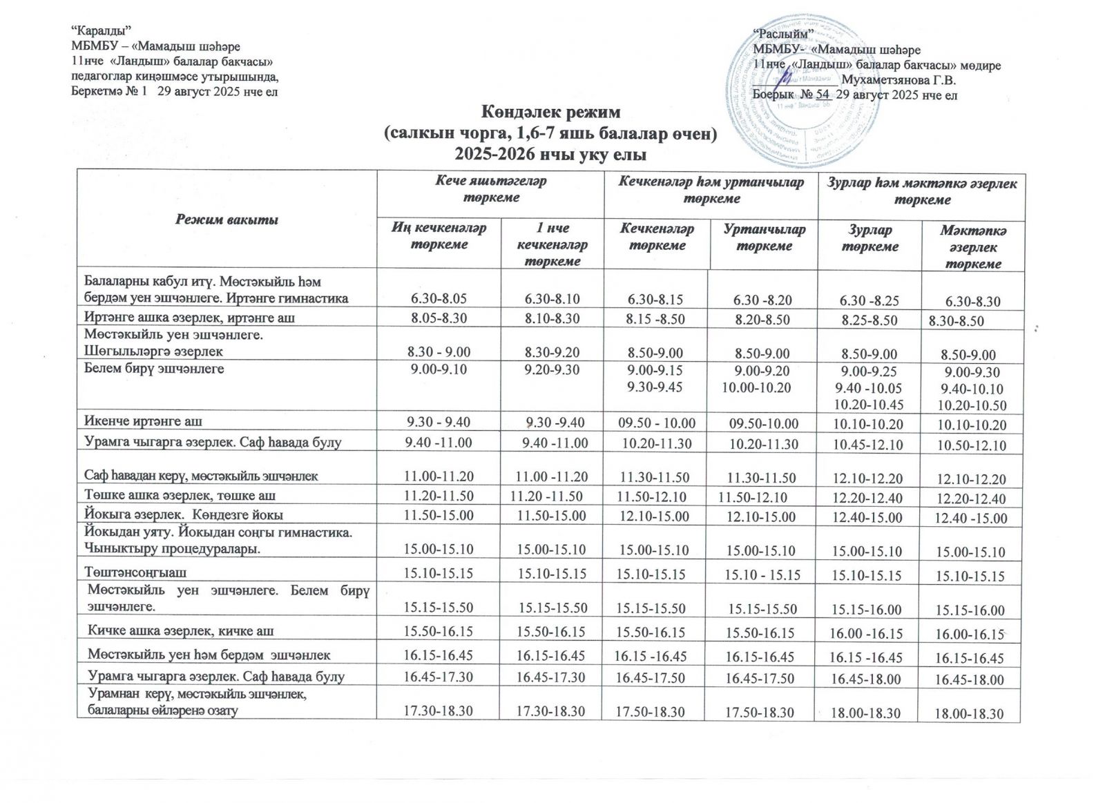 Режим работы детского сада: 5 - ти дневная рабочая неделя; длительность работы детского сада – 12 часов: с 6.30 до 18.30 часов ежедневно, кроме праздничных и выходных - субботы, воскресенья. Основной структурной единицей детского сада является группа детей дошкольного возраста. В группах общеразвивающей направленности предельная наполняемость устанавливается в зависимости от возраста детей и с потребностью мест.