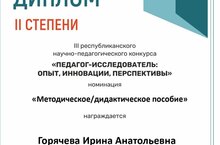 Диплом 2 степени III республиканского научно- педагогического конкурса "Педагог- исследователь : опыт, инновации, перспективы " в номинации Методическое -дидактическое пособие воспитатель Горячева Ирина Анатольевна. 23.01.2026