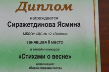 Диплом 2 место наградили Сиражетдинову Ясмину в конкурсе "Стихами о весне"в номинации "Весна словами поэта"./ Конкурста 2 урын, диплом. 20.04.2024