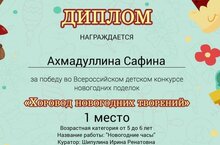Дипломами 1 место награждены воспитанники детского сада Ахмадуллина Сафина и Давыдова Диана во Всероссийском детском конкурсе новогодних поделок "Хоровод новогодних поделок"/"Яңа ел сәгате "Россия куләм бәйгесендә зурлар төркеменнән Ахмадуллина Сәфинә һәм Давыдова Диана 1 нче урын яуладылар. 29.12.2023