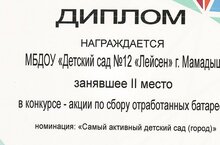 Диплом 2 место в конкурсе - акции по сбору отработанных батареек в номинации "Самый активный детский сад (город)"/Кулланган батарейкаларны җыю буенча бакчабыз шәһәр буенча" иң актив балалар бакчасы" булды һәм икенче урын яулады. " 18.12.2023