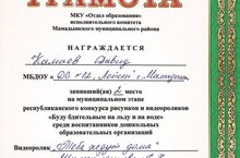 2 место Камаев Давид в муниципальном этапе республиканского конкурса рисунков и видеороликах "Буду бдителен на льду и на воде" среди воспитанников ДОО. " / Боз өстендә һәм суда сак булырмын!" - конкурс нәтиҗәләре. 04.12.2023