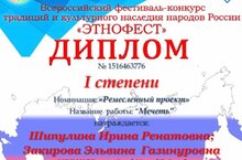 Диплом первой степени Всероссийского фестиваля - конгкурса традиций и культурного наследия народов России "Этнофест" получили воспитатели Шипулина Ирина Ренатовна и Закирова Эльвина Газинуровна в номинации "Ремесленный проект " - "Мечеть 04.12.2023