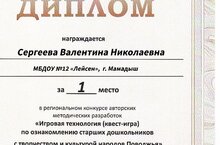 Первое место в региональном конкурсе авторских методических разработок "Игровая технология (квест- игра) по ознакомлению старших дошкольников с творчеством и культурой народов Поволжья" 07.03.2023
