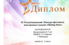 Диплом 1 место на Республиканском конкурсе- фестивале иностранных языков "Shininq Stars" в номинации "Театральная постановка"(английский язык) 06.05.2022