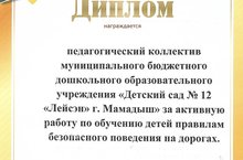 Сегодня наш коллектив наградился дипломом ОГИБДД России по Мамадышскому району и Государственного бюджетного учреждения "Безопасность дорожного движения" за активную работу по обучению детей правилам безопасного поведения на дорогах. 04.12.2020