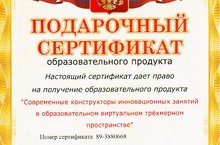Наш детский награжден подарочным сертификатом образовательного продукта "Современные конструкторы инновационных занятий в образовательном виртуальном трёхмерном пространстве"" 27.09.2019