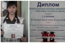 Ученица 8 класса приняла участие во всероссийском конкурсе творческих работ "Моя мама лучшая на свете" организованный образовательным центром "МАГАРИФ" и награждена дипломом 1 степени. Поздравляем!