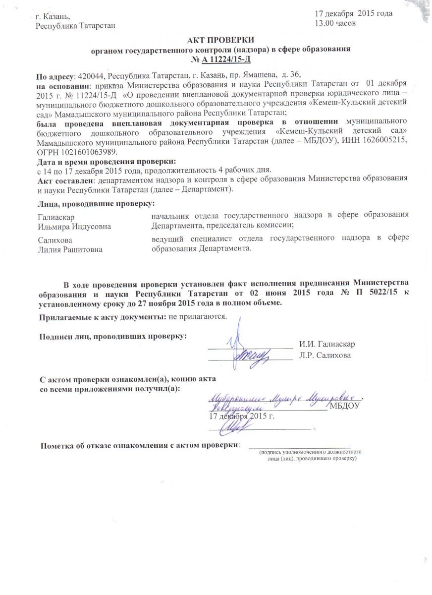 Акт проверки органом государственного контроля (надзора) в сфере образования №А 11224/15-Д