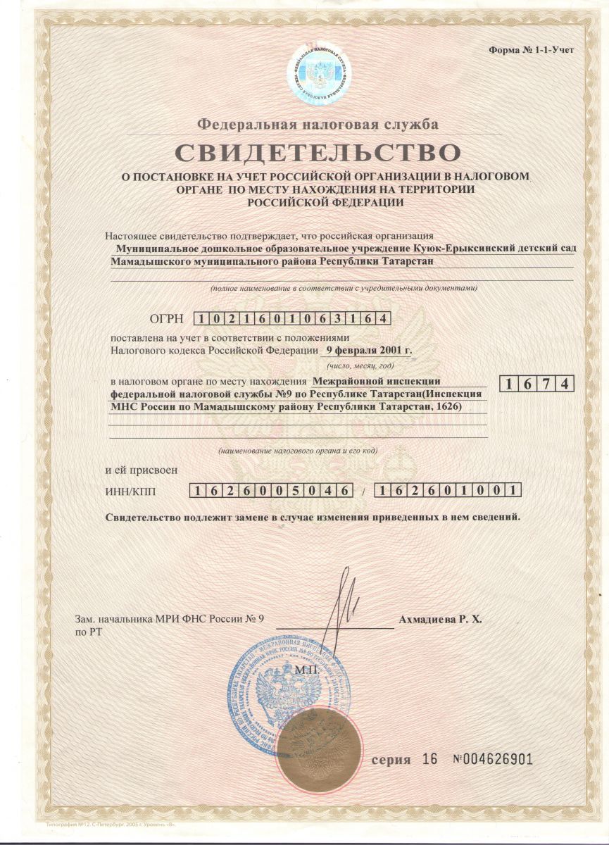 Адрес: 422151,Республика Татарстан, Мамадышский район, село Куюк Ерыкса, улица Гагарина, дом № 32