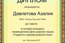 Дорогие друзья! Спешим поделиться радостной новостью: подведены итоги районного онлайн-конкурса стихов и песен, посвященного Международному Дню родного языка! Организатором этого мероприятия выступил МБОУ ДО "Дом детства и юношества".Особенно приятно отметить, что наша ученица, Давлетова Азалия из МБОУ "Кемеш-Кульская ООШ", заняла почетное 1 место! Азалия блестяще исполнила стихотворение Габдуллы Тукая "Туган тел" (Родной язык), покорив жюри своим талантом и искренностью. Мы от всей души поздравляем Азалию с этой заслуженной победой и выражаем огромную благодарность ее руководителю, Гайнутдиновой Р.М., за подготовку и поддержку!