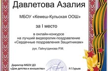 Очередная победа нашей Давлетовой Азалии! С гордостью сообщаем вам о новой блестящей победе нашей ученицы – Давлетовой Азалии! Недавно были подведены итоги районного онлайн конкурса на лучший видеоролик-поздравление "Сердечные поздравления защитникам". И наша Азалия, ученица МБОУ "Кемеш-Кульская ООШ", заняла 1 место!