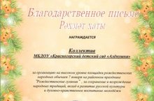 7 января коллектив МБДОУ "Красногорский детский сад "Аленушка" участвовал на районном празднике "Рождественские гуляния". Коллектив был награжден благодарственным письмом за организацию на высоком уровне площадки рождественских народных обычаев, за сохранение и возрождение народных традиции, вклад в развитие русской культуры и духовно - нравственное воспитание молодежи.