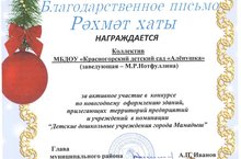 Коллектив детского сада награжден Благодарственным письмом Главы района А.П.Иванова за активное участие в конкурсе по Новогоднему оформлению зданий, прилегающих территорий предприятий и учреждений в номинации "Детские дошкольные учреждения города Мамадыш"