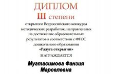 Мугтасимова Фанзия Марселевна награждается дипломом III степени за участие во Всероссийском конкурсе методических разработок, направленных на достижение образовательных результатов в соотсветсвии с ФГОС дошкольного образования "Радуга открытий".