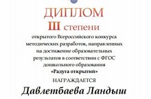 Давлетбаева Ландыш Ринуровна награждается дипломом III степени во Всероссийском конкурсе методических разработок, направленных на достижение образовательных результатов в соотсветсвии с ФГОС дошкольного образования "Радуга открытий".