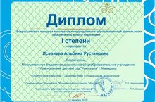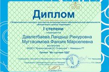 Дипломом победителя 1 степени награждается Давлетбаева Ландыш Ринуровна во всероссийском конкурсе "Достижения молодых" в номинации Учебный проект секции Дополнительное образование. Работа:Мы с тобой природа. Руководитель:Нотфуллина Миляуша Рафгатовна.