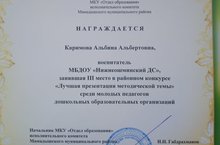 Каримова Альбина Альбертовна, воспитатель занявшая lll место в районном конкурсе "Лучшая презентация методической темы" среди молодых педагогов дошкольных образовательных организаций. Молодец поздравляем! 20.08.2020