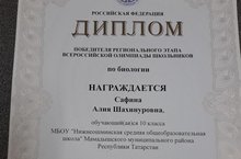 Поздравляем Сафину Алию, победителя регионального этапа Всероссийской олимпиады школьников по биологии.