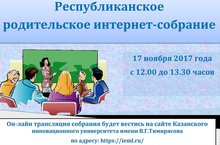 Онлайн-трансляция собрания будет вестись на сайте Казанского инновационного университета имени В.Г.Тимирясова по адресу: https://ieml.ru/. Первая встреча экспертов и родителей в рамках Республиканского родительского интернет-собрания состоится 17 ноября 2017 года (в пятницу) с 12:00 до 13:30 часов. -