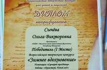 В феврале на Всероссийском творческом конкурсе "Зимнее вдохновение" Сычева Елизавета заняла первое место в номинации: фортепианная игра. Класс преподавателя Штейнгауэр И. К.