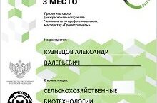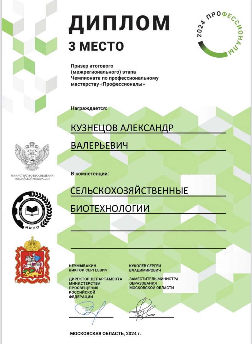 Сегодня на торжественной линейке чествовали призера (3 место) итогового (межрегионального) этапа Чемпионата по профмастерству "Профессионалы" в компетенции "Сельскохозяйственные биотехнологии" Кузнецова Александра.