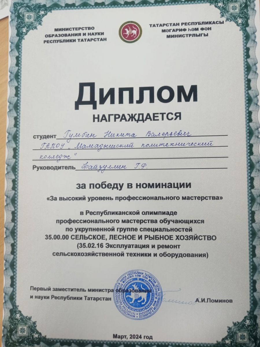 20 марта наш студент Гумбин Никита принял участие в Республиканской олимпиаде профессионального мастерства по укрупненной группе специальностей среднего профессионального образования 35.00.00 Сельское, лесное и рыбное хозяйство (35.02.16 Эксплуатация и ремонт сельскохозяйственной техники и оборудования). Поздравляем Никиту с 4 местом!!!