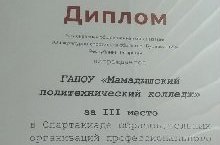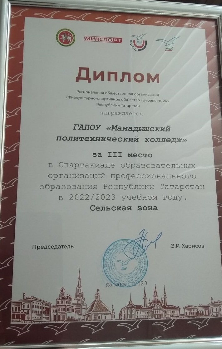 Региональная общественная организация "Физкультурно-спортивное общество "Буревестник" РТ наградил Дипломом ГАПОУ "Мамадышский политехнический колледж" за III место в Спартакиаде образовательных организаций ПО РТ в 2022-2023 учебном г. Сельская зона. Татарстан Республикасының региональ җәмгыять оешмасы «Буревестник» «Физкультура –спорт җәмгыяте» «Мамадыш политехник көллиятен» Татарстан Республикасы мәгариф оешмалары спартакиадасы буенча 2022-2023 уку елында 3нче урын алуы белән котлады. Авыл зонасы.
